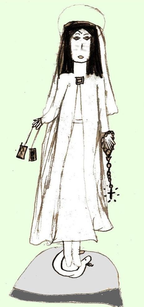 Obrazek Maryi jest wykonaną w 1995 roku przez Jagodę Kaszowską kopią figurki Matki Boskiej, nazywanej "Matką Boską z Garabandal". Przed tą figurką modlono się w wielu rodzinach, zwłaszcza w Belgii. Maryja ma na jednej ręce szkaplerz, a w drugiej – Różaniec. Szkaplerz to symbol szaty oznaczającej, że ktoś chce w pełni należeć do Maryi. Jeśli ktoś nosi szkaplerz, stara się żyć dobrze, naśladuje Maryję, modli się do Niej i szerzy Jej kult, to nie tylko uniknie piekła, ale Maryja wyprosi dla niego duże skrócenie czyśćca, jeśli – z powodu swoich grzechów – będzie tam musiał iść. Odpowiednikiem szkaplerza jest szkaplerz w formie medalika, wykonanego z metalu.